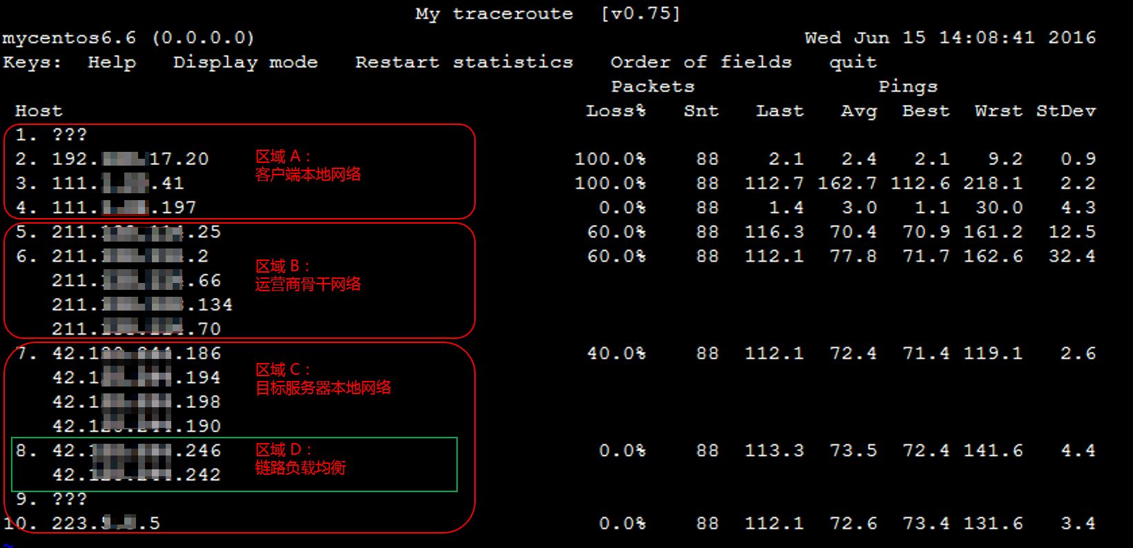 由于mtr命令有更高的准确性,本文以mtr命令测试结果为例,对链路测试结果的分析进行简要说明。后续的说明,均以如下链路测试结果示例图为基础进行阐述。