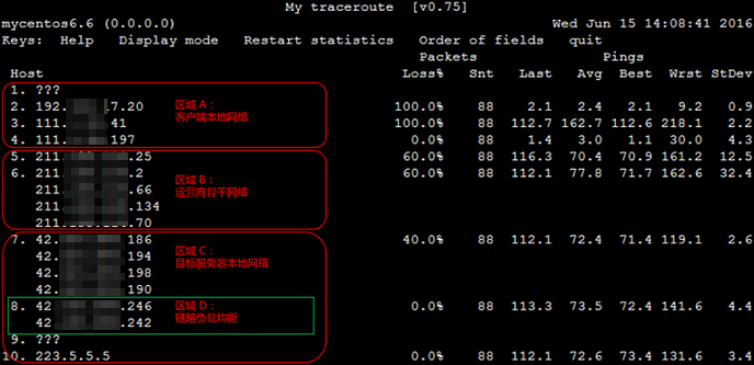 • 区域C:目标服务器本地网络,即目标主机归属网络提供商网络。针对该区域异常,需要向目标主机归属网络提供商反馈问题。